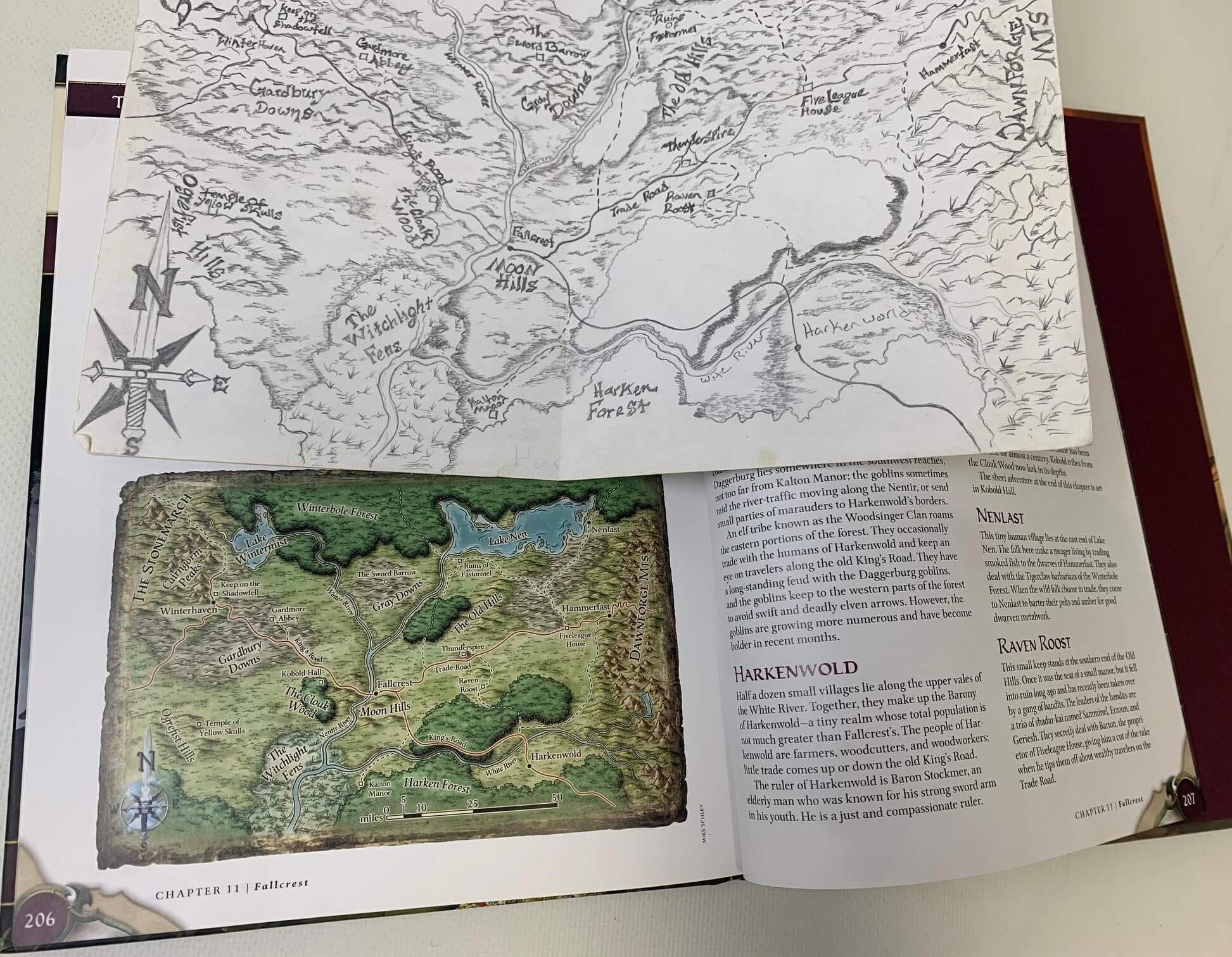 In this Found Your Sheet article, we highlight a really neat hand-drawn D&D campaign map we found in a trade. The map comes directly from the 4E Dungeon Master’s Guide (p. 206). I’m really interested in using this map because I like the hand-drawn style, but also because it’s from Fourth Edition. 4E is arguably the most divisive version of D&D, and I want to show how, even if you don’t like a particular ruleset, you can still make use of it in your 5E (or other edition) game. Also, 4E books are not (as of this writing) very expensive. You can probably pick up a 4E DMG from Noble Knight Games for a reasonable price right here.