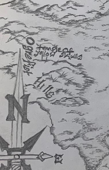 So how do we do it? Let’s take a look at what the 4E Dungeon Master’s Guide tells us about this map. By the way, I can’t use exact text here for copyright reasons, so I’m going to be writing in general terms. If you want to do this exercise yourself, follow along in a physical DMG. The region covered in this map is called the Nentir Vale, and it’s part of the Forgotten Realms campaign setting. The 4E DMG details most of the locations mentioned on the map, but it only gives a very brief overview of each. For this example, I’ll choose a feature from the map that interests me. How about the Temple of Yellow Skulls?