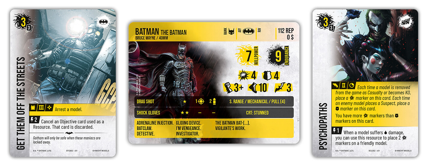 The Batman Miniature Game App makes the game easier. Available for Android and IOS, it contains the most up-to-date rules and character cards. The app provides all the character cards for both current and “Eternal” characters. “Eternal” characters are miniatures which Knight Models have discontinued and are no longer available. This allows players to continue playing even with older models!