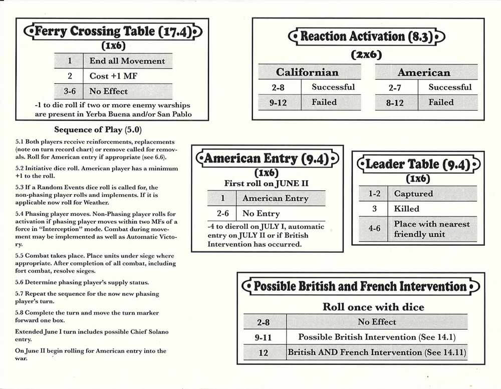 The game is a “two-act” play. Several key—often random—events may play a powerful role in the final outcome of the fighting. The game will take 1-3 hours to play to completion. There are two major events that influence the course of Bear Flag Republic.