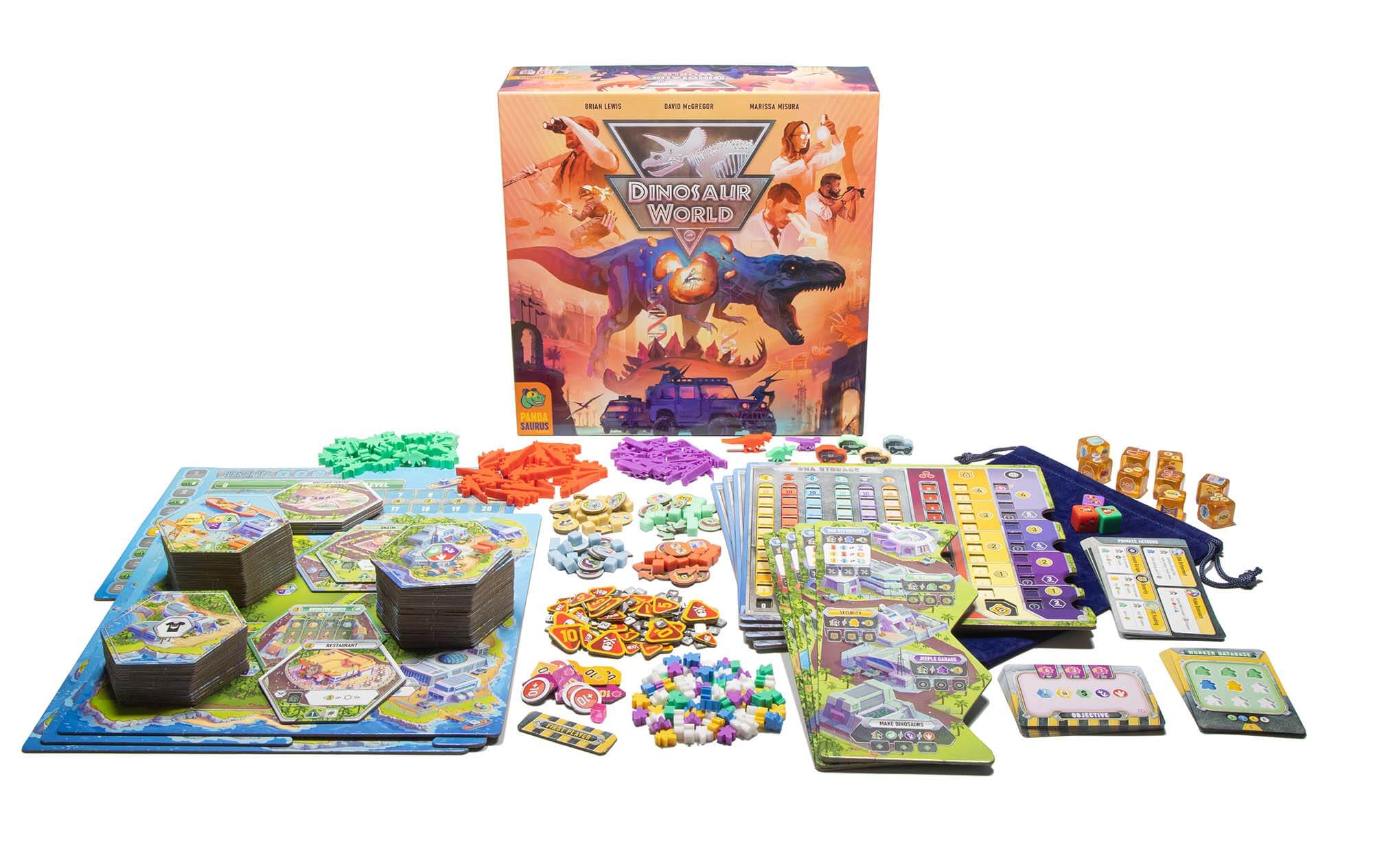 Each round in Dinosaur World, you draft a new résumé card to acquire new workers; spend workers to take public actions building your park and acquiring DNA; spend further workers to take private actions improving that park; then drive your jeep around experiencing the wonder and excitement of what you have built! Throughout the game you acquire victory points through a variety of means — and possibly a few visitor deaths as a natural consequence of overly enthusiastic dinosaur encounters. At the end of the game, you lose points if you accumulated too many deaths, then the player with the most points wins!