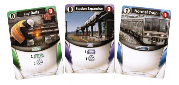 In Alderac Entertainment Group‘s Trains, you use deck-building to build a railway network in Japan. In addition to buying better cards for your deck, you will build train stations and lay rail on the double-sided map board, connecting cities on either the Tokyo or Osaka maps.