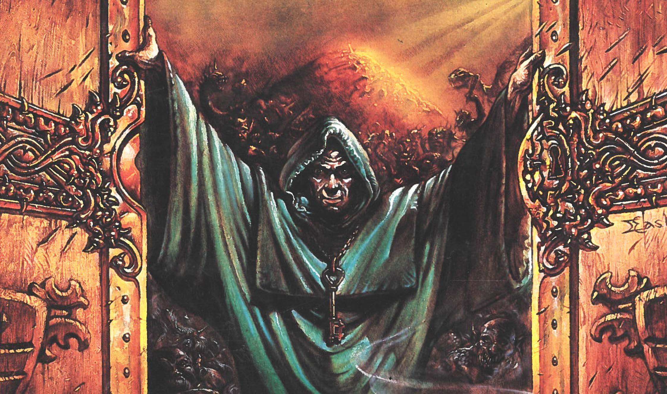 classic rpg adventure artwork robed man throwing open large wooden doors