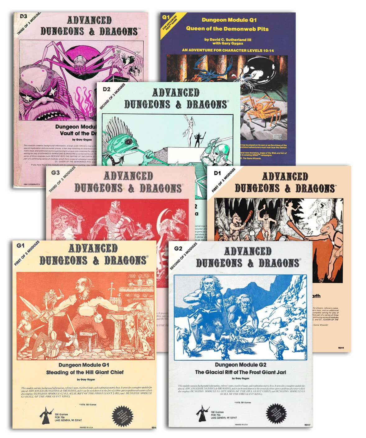 This run of seven modules was initially released as three different series: Against the Giants (G1–G3), Descent into the Depths (D1–D3) and Queen of the Demonweb Pits (Q1):