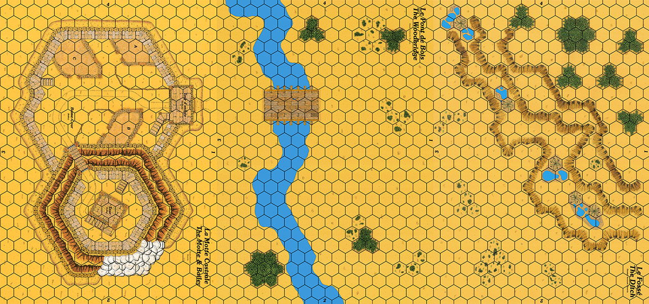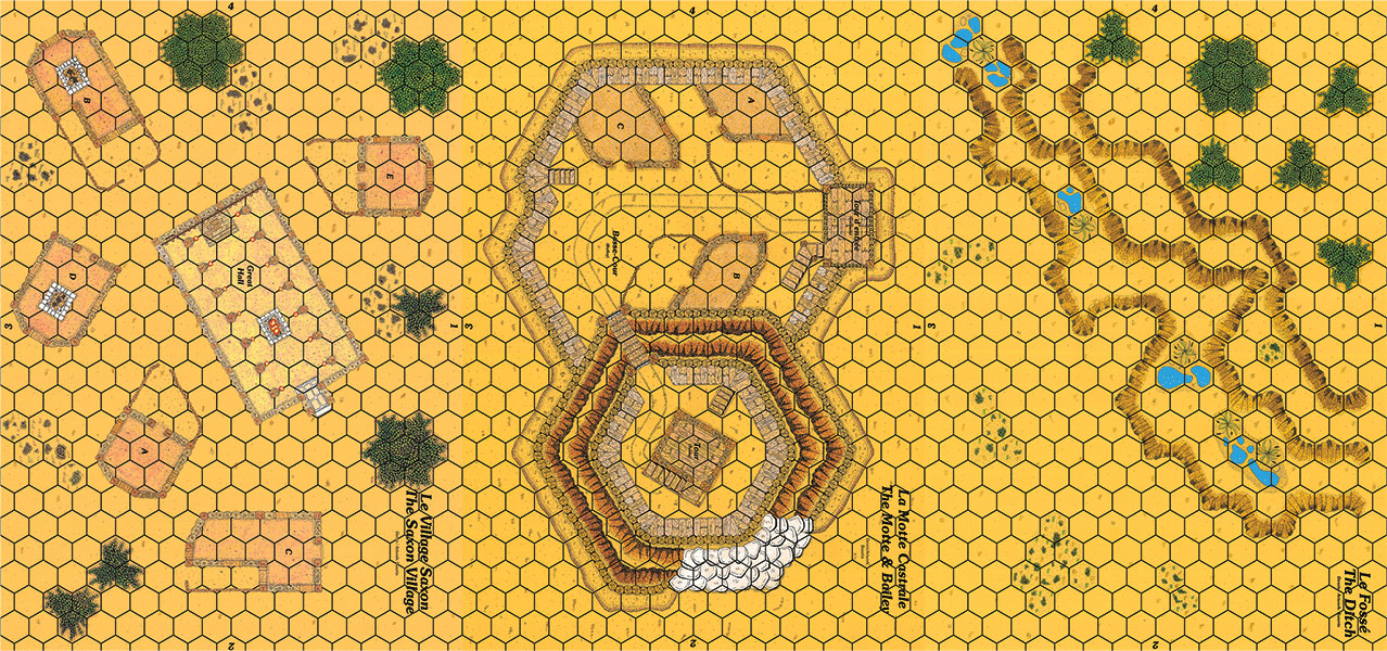The Motte & Bailey map displays a wooden tower on top of a motte, overlooking a small bailey with buildings, surrounded by a wooden palisade and moat. Players position buildings to simulate a small village on the Woodbridge map. A marshy bottom is a challenging obstacle for cavalry to cross on The Ditch. The Saxon Village is a new map which consolidates the various building overlays which were provided with the first version of the game.