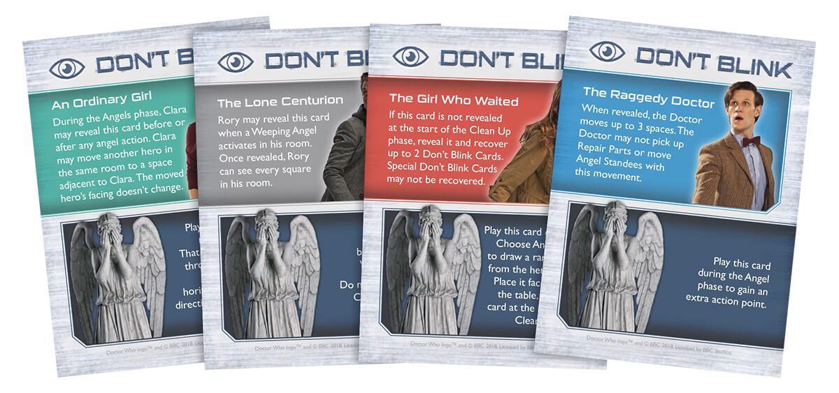 In Don’t Blink, players are divided into two teams. One player takes on the role of the Weeping Angels and attempts to capture the others. The remaining players take on the roles of the Doctor and companions, attempting to find the necessary pieces to repair and summon the TARDIS in order to make their escape!