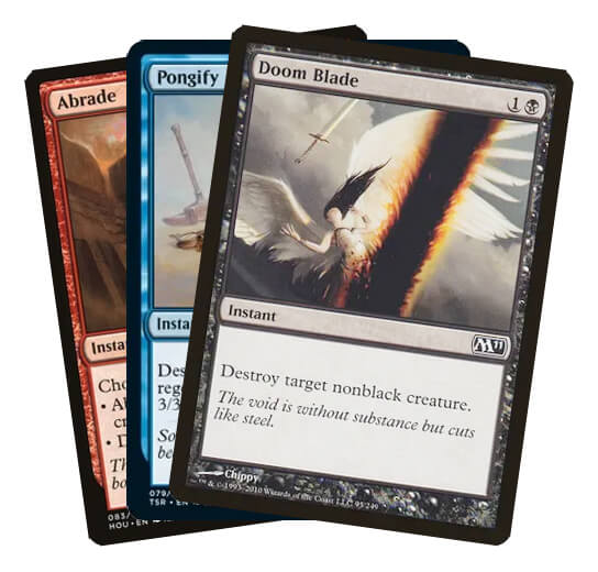 Whenever possible, you want to draft removal mechanic cards. Removal cards say things like “Destroy target creature,” “Exile target creature,” or “Deal damage to target creature.” Removal cards get rid of opponent’s creatures that are messing with your game plan.