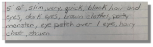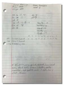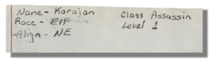 Perhaps my favorite thing about Karajan is the use of notebook paper as a character sheet. There’s something really charming about the handwritten look of it. There’s no date on this character sheet, but the class and level information marks it as AD&D 1st Edition. Karajan is a 1st level Chaotic Evil Elf Assassin.