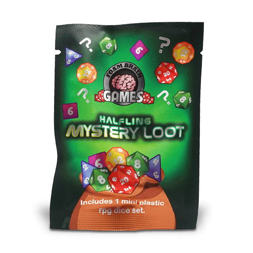 These itty-bitty adorable dice are a hit at convention booths and now they’re available to everyone! There are 20 different colors of sets available in a bright green Mystery Loot Bag – whichever color you get is a win because these little dice are so fun!