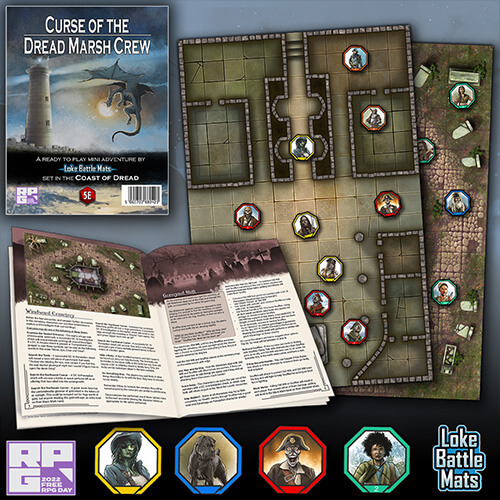 Curse of the Dread Marsh Crew is a ready to roll 5E adventure by Loke Battle Mats. Set in Maps from the Coast of Dread, this adventure includes Battle Maps and cut out tokens for Characters, Adversaries and Terrain.