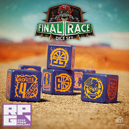 Final Race Dice Set: Step on it! The Final Race starts now! Keep control and don’t lose your cool, or let the red mist cover your eyes – whatever lets you win! The various post-apocalyptic markings on the dice faces tell you one thing: there is nothing but the race! With their background being blue and paintings orange, you cannot lose!