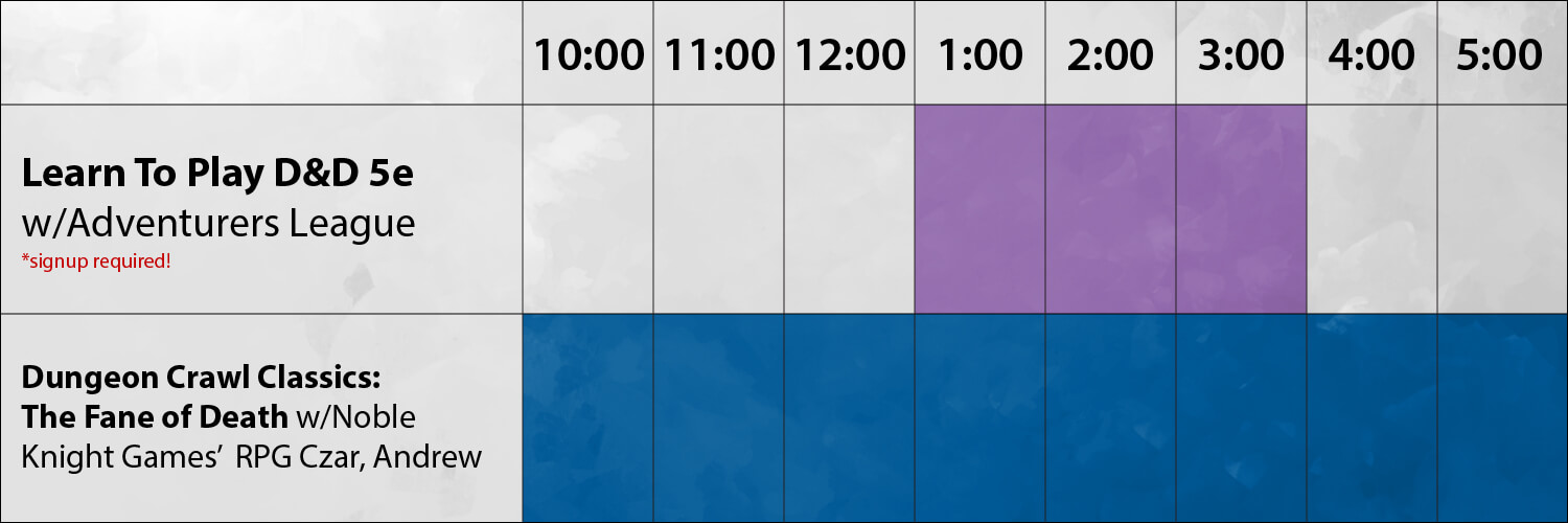 - No signup required. This is a drop-in RPG event using the Dungeon Crawl Classics RPG system. Level zero characters and dice will be provided. Each session will last half an hour. Enter the Fane of Death, grab treasure if you can, and die in spectacular fashion.