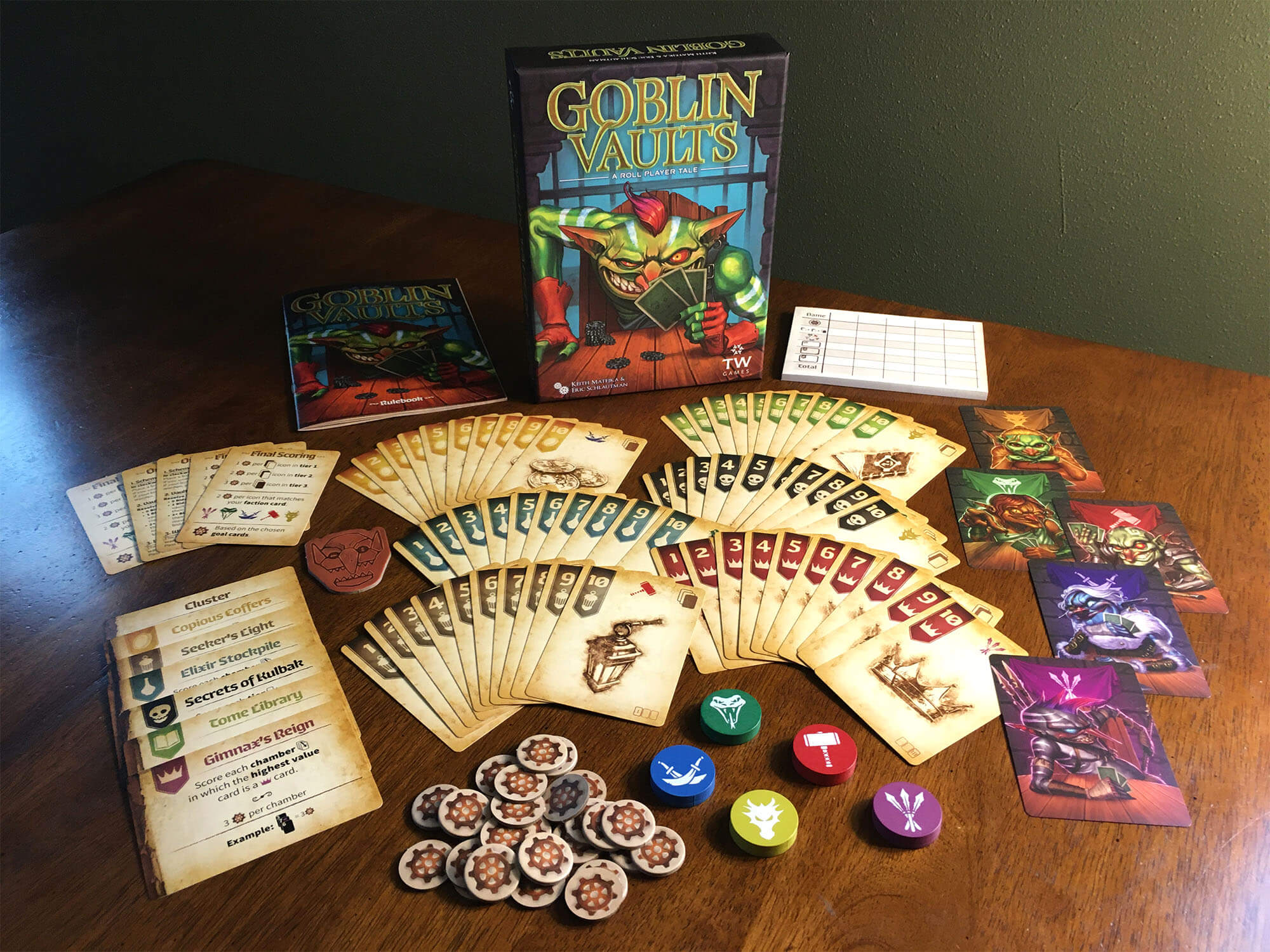 Goblin Vaults is a strategy card game for 1-5 players featuring bidding, card placement, and scoring patterns. In the game, you wager cards to win loot from the central cell block, then stash that loot wisely in your vault, earning gears based on the position of cards within that vault. You can also gain gears from scoring objectives that change each game.