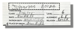 According to the date on his character sheet, Juhanas Booda was created on Nov. 11, 1984. He’s a character for 1st Edition AD&D. Mr. Booda (I’ve decided that he insists people call him Mr. Booda) is a Lawful Evil Dwarf (technically it says “Dwarpf”) fighter who hails from the Iron Hills. His patron deity is Hephaestus, so I’m guessing he’s really leaning into the whole dwarf-as-artisan thing.