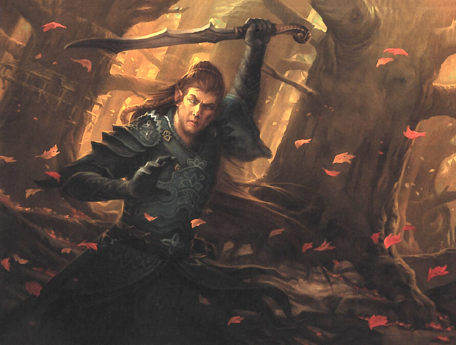 illustration of an elven bladesinger with his sword above his head in a readied position in the forest