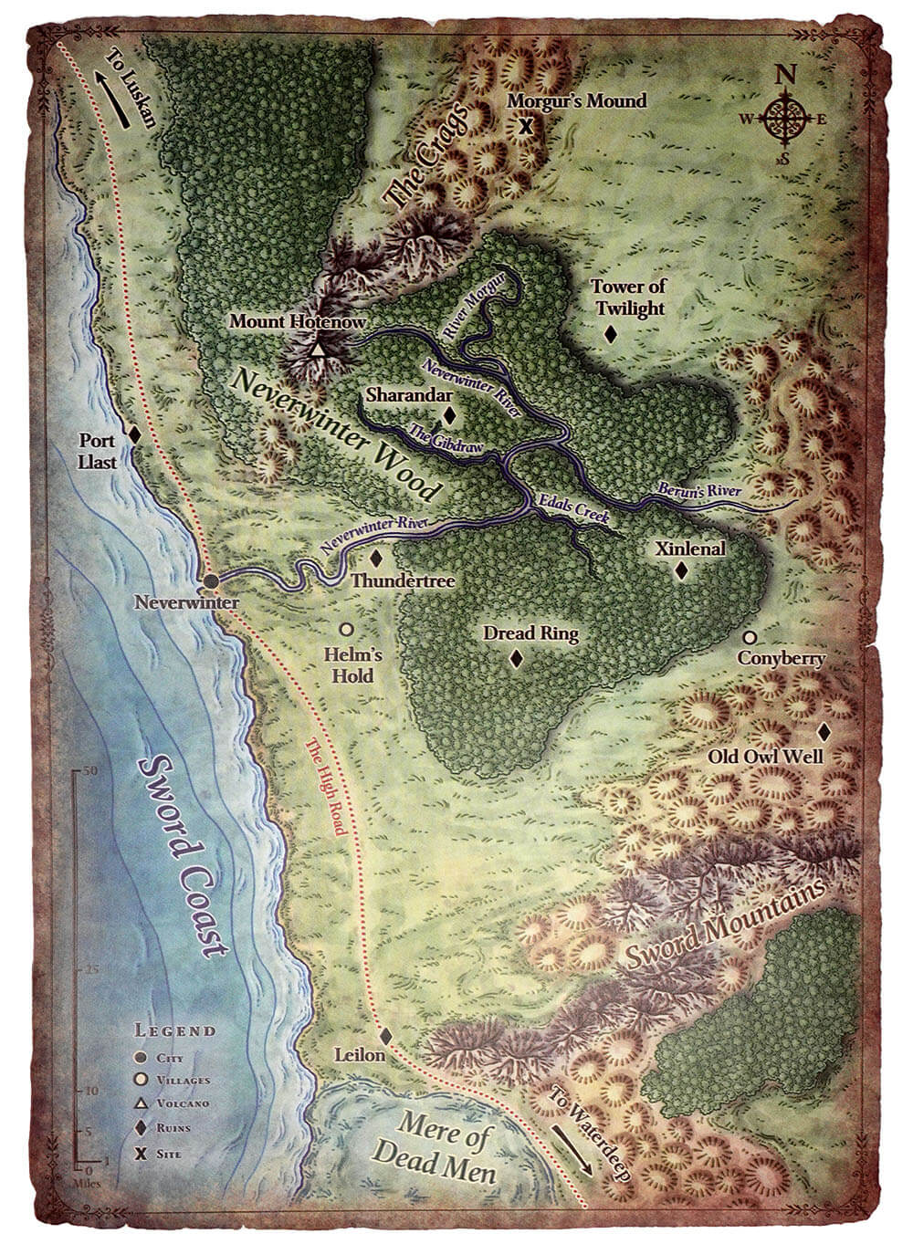 The Forgotten Realms is my favorite D&D world setting. I fell in love with it when I read an article in Issue 110 of Dragon magazine in June 1986. The article—titled All About Elminster—detailed the Forgotten Realms’ most powerful wizard and foremost sage. Ed Greenwood—the Forgotten Realms’ creator—penned the article. It included a black & white illustration of Elminster, smoking his pipe and inscribing a scroll by the light of a candle under the watchful eye of an owl. I was instantly hooked, and I wanted to learn more about the world where that mage lived. Since reading that article, my D&D characters have walked most of the paths, climbed some of the tallest mountains and sailed many of the waters of the Forgotten Realms. Yet, to this day, I still have corners of that wonderful world left to explore.