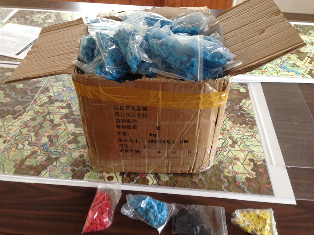 Once he had enough pre-orders, Weir would contract with the printing company and purchase additional components like wooden cubes, game boxes, and packing materials. The actual printing of the game could take from three to six months. Assembling the games was also labor-intensive. Weir often printed larger items, like maps, himself. Counters were printed and cut on hand-operated machinery.