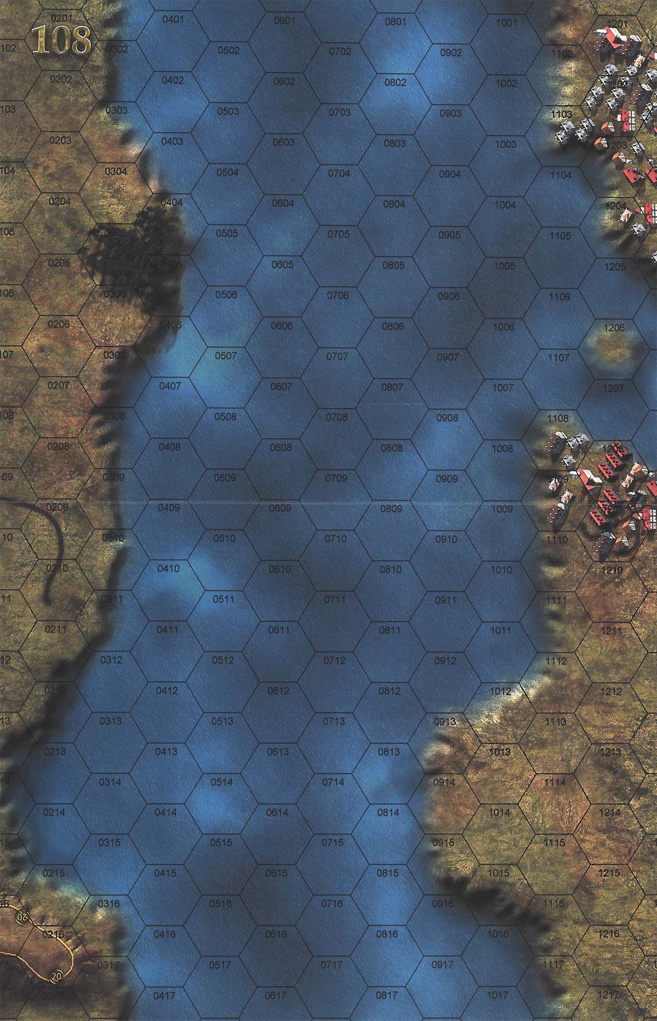 River Battleships is a complete, stand-alone game in Playbook format, which means that it includes everything you need to play in the package—except dice! The special rules are based heavily on the Second Great War: River Fleets special Gold Club set done by Matt War and Daniel Rouleau, with some modifications. Chief among them is the switch from gigantic double-sized pieces for river monitors to the standard naval game size; that allows the river monitors to occupy just one hex on the map which in turn enormously simplifies game play.