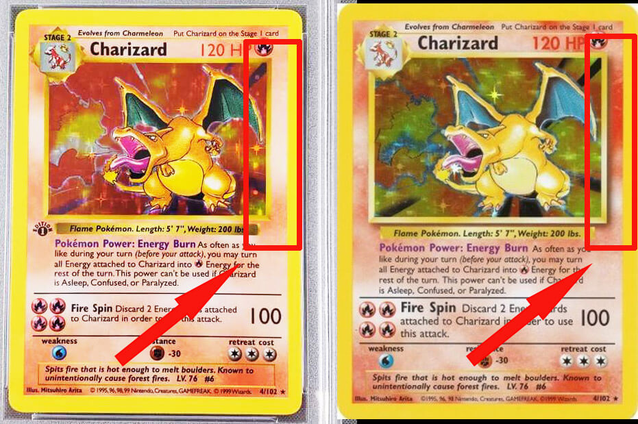 Below is a comparison of a first edition, Shadowless Charizard (the left) and a standard base set Charizard (the right) which has a drop-shadow.