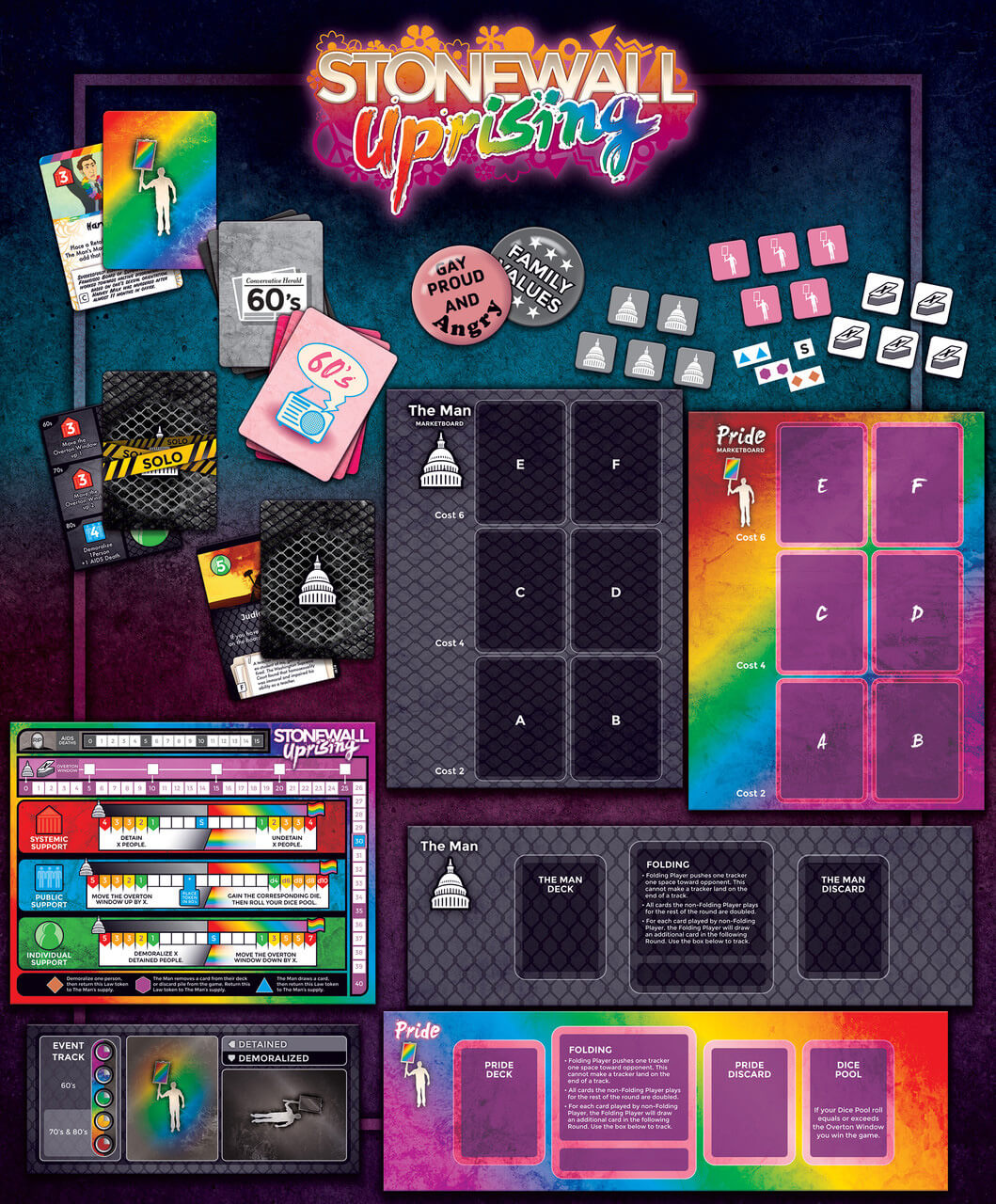 If playing as The Man has got you down, fear not, there is a fix for you! Designer Taylor Shuss worked with solo game design specialist Mike Heiman (USS Laffey: The Ship That Would Not Die) to create a deck of cards that controls The Man, allowing for tense solo play for the Pride player.