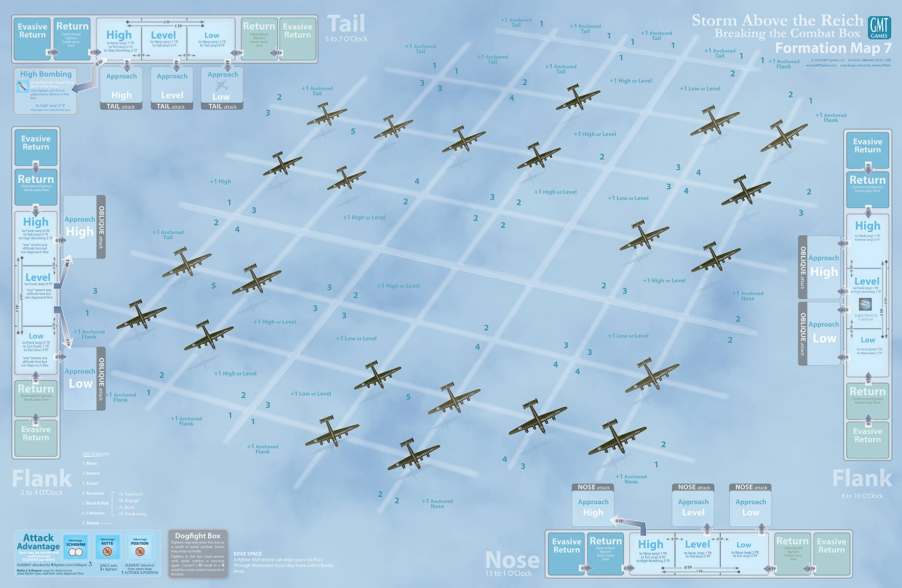 The game comes with two double-sided map boards, four maps in all. As a set they chronicle the development and increasing lethality of the bomber formation.