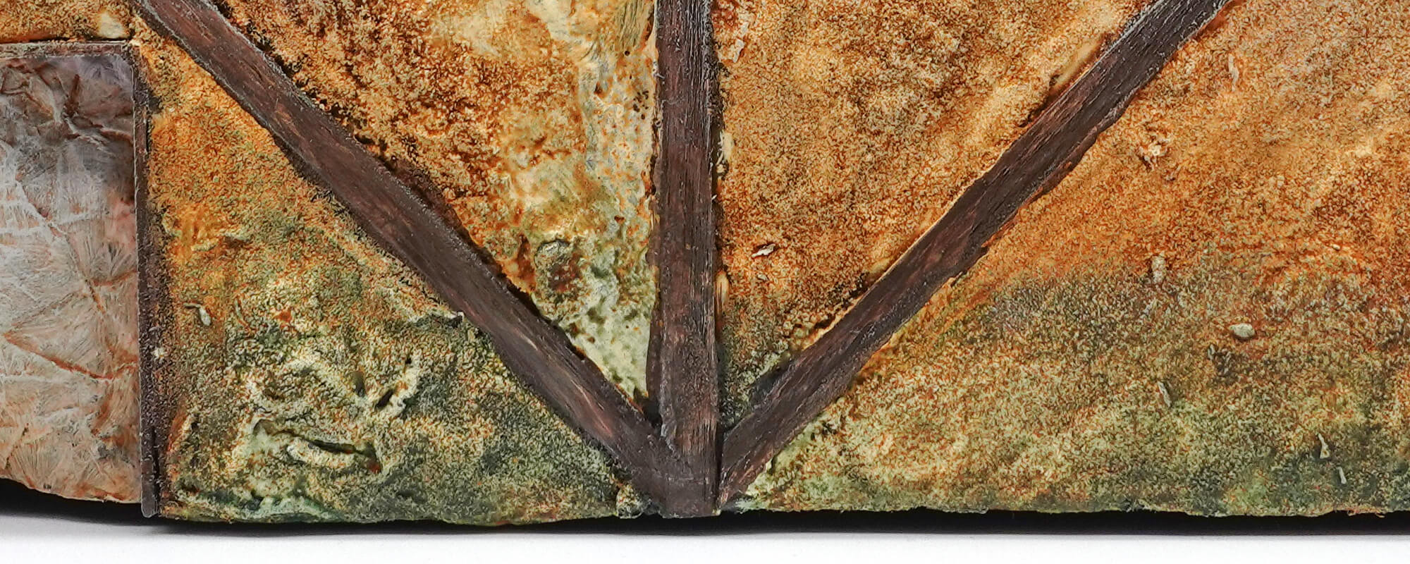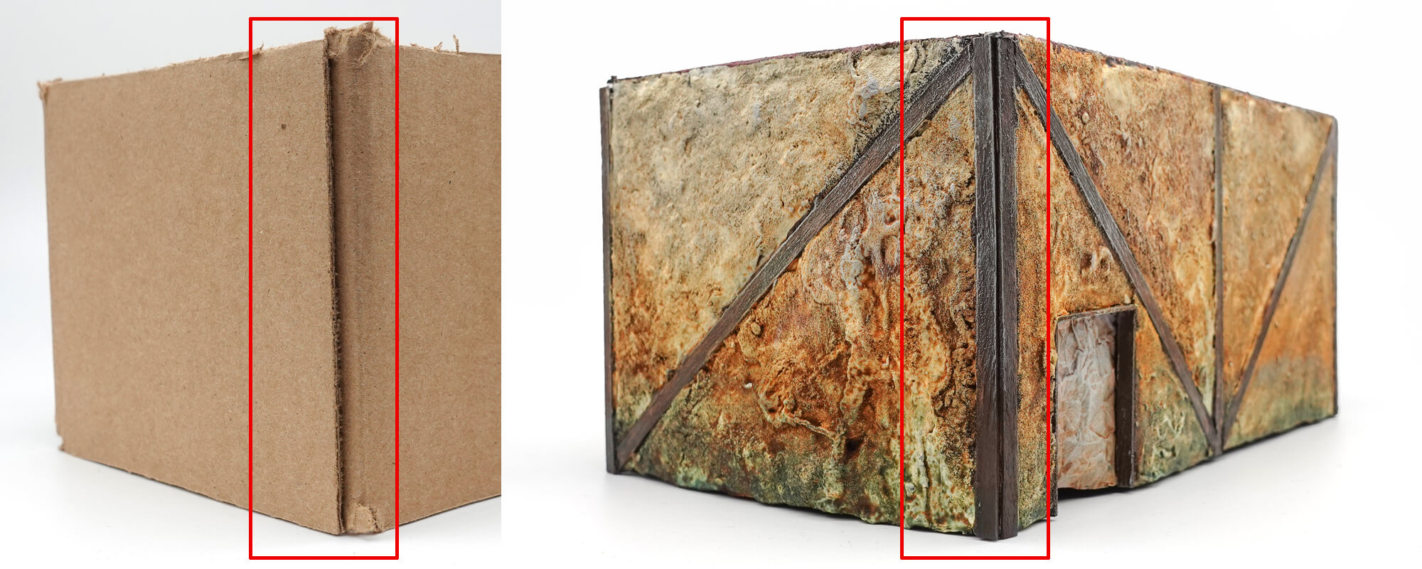 - Adhere the wooden pieces to the exposed cardboard corrugation with tacky glue; hot glue is too messy here, and the tacky glue will dry faster than PVA glue