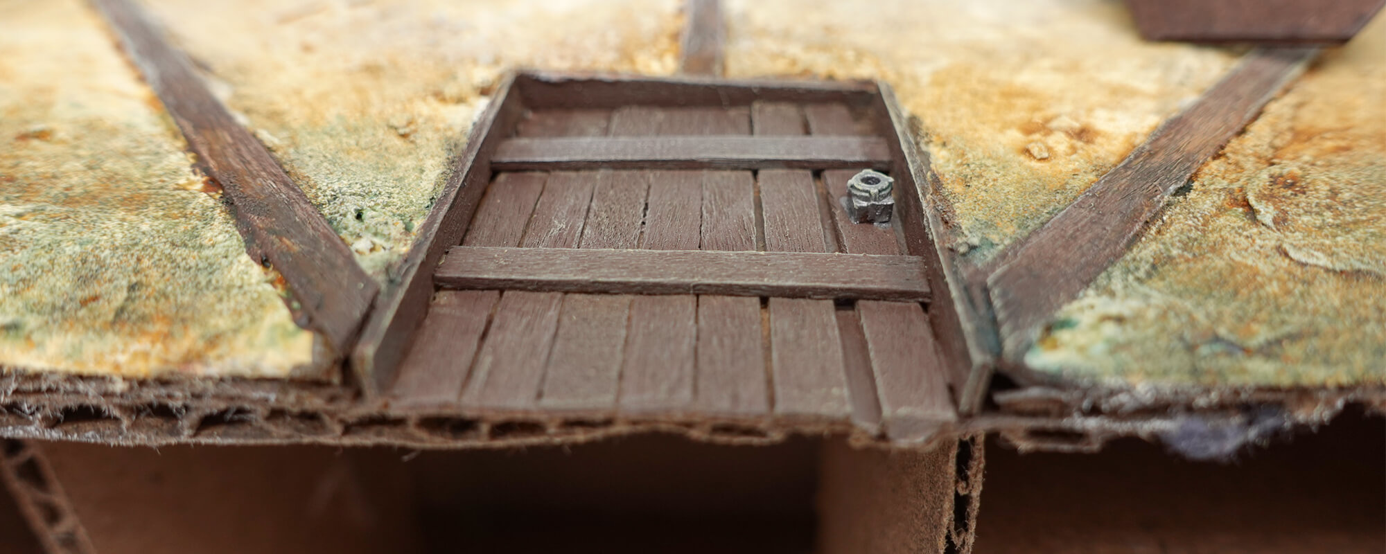 - Apply a heavy dose of Dark Wash, by Huge Miniatures, to the roof, all the wood, and the doorknob