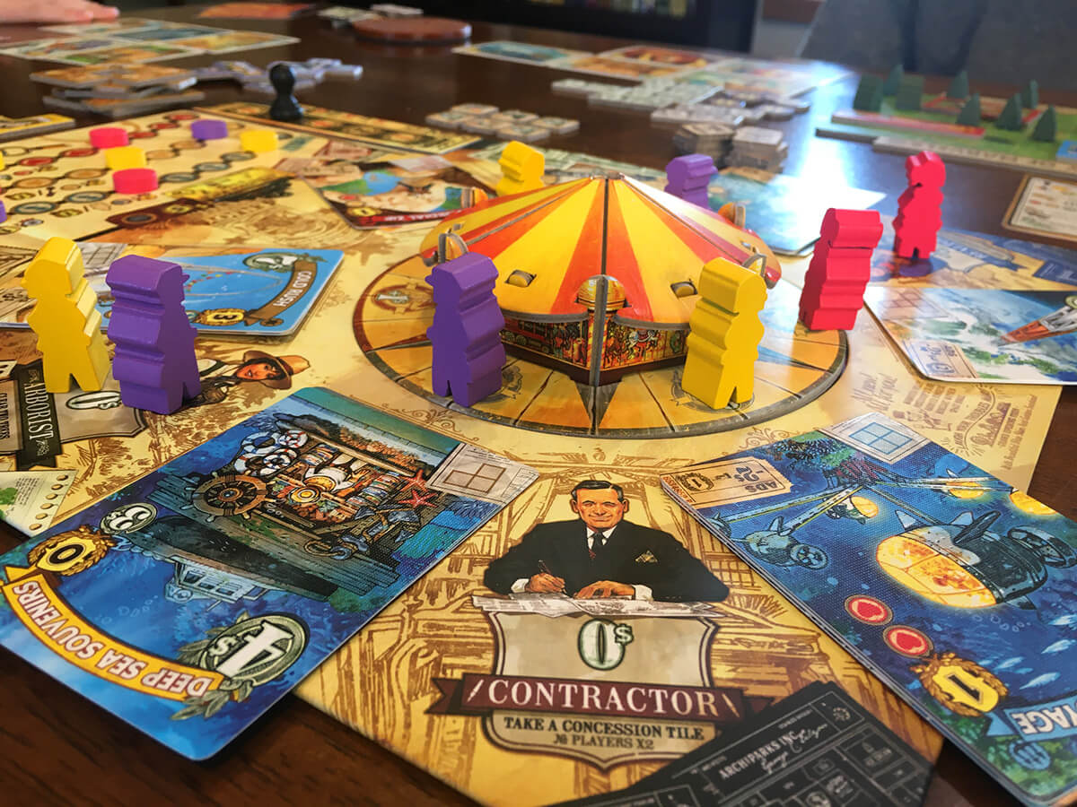 Each month, players take turns placing workers on the game board to take actions like removing trees, building concessions and attractions, and buying more property to make their growing theme parks as attractive to Visiting People (VP tokens) as possible.
