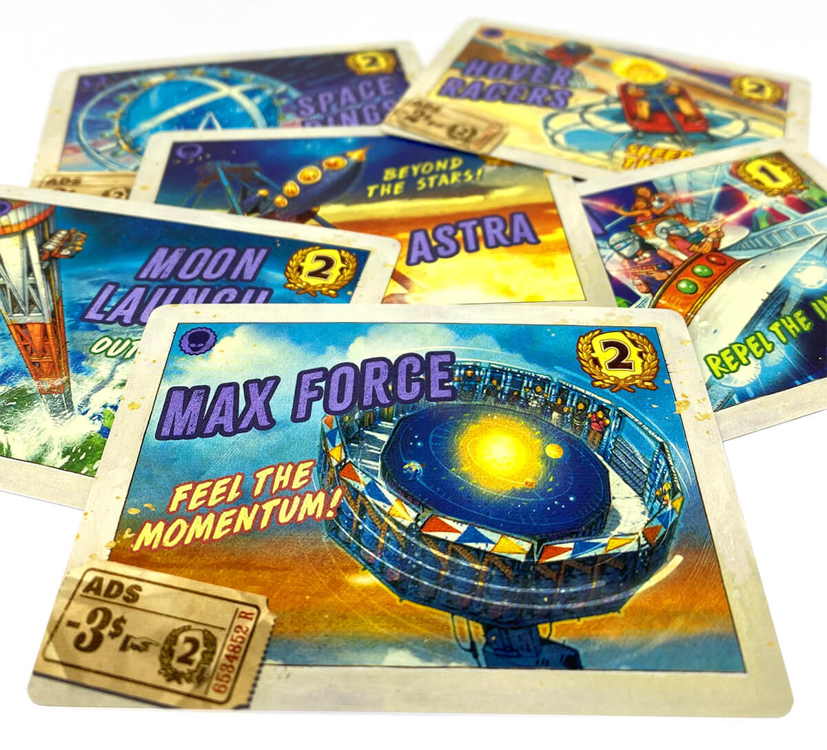At the end of each month, rewards are given to the player with the park that best exemplifies raw emotions (Thrill, Awe, and Joy). After five months, the player with the most VP tokens wins!