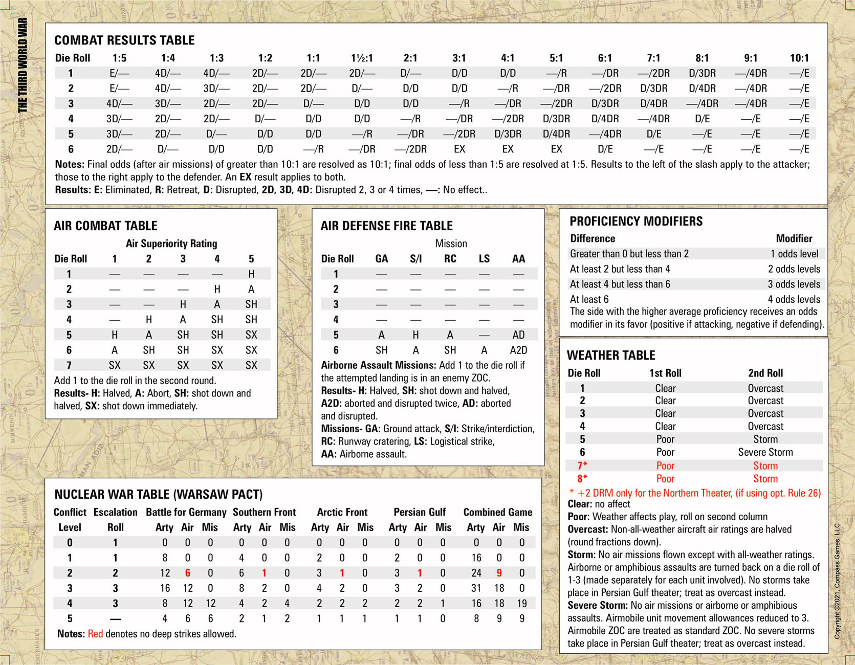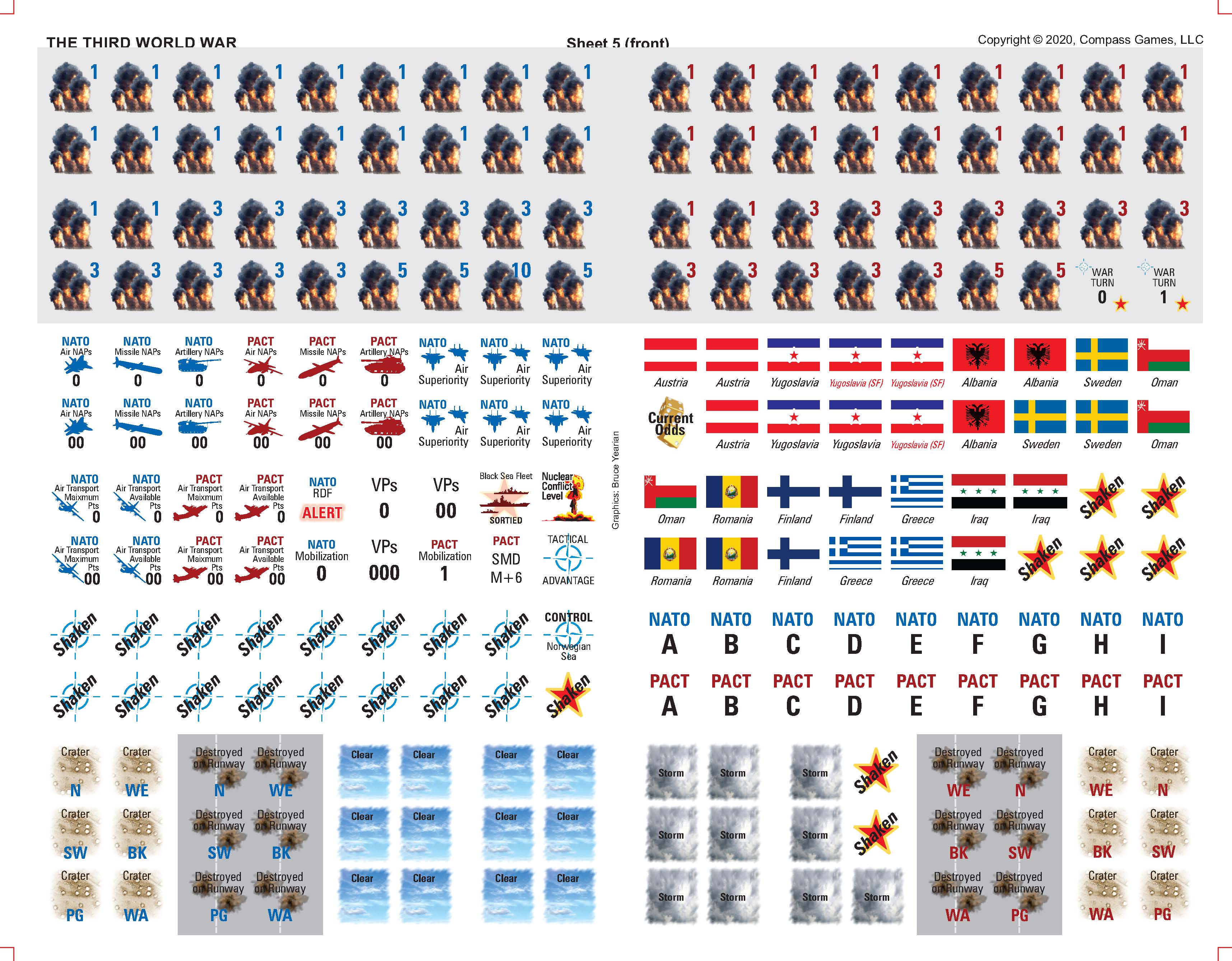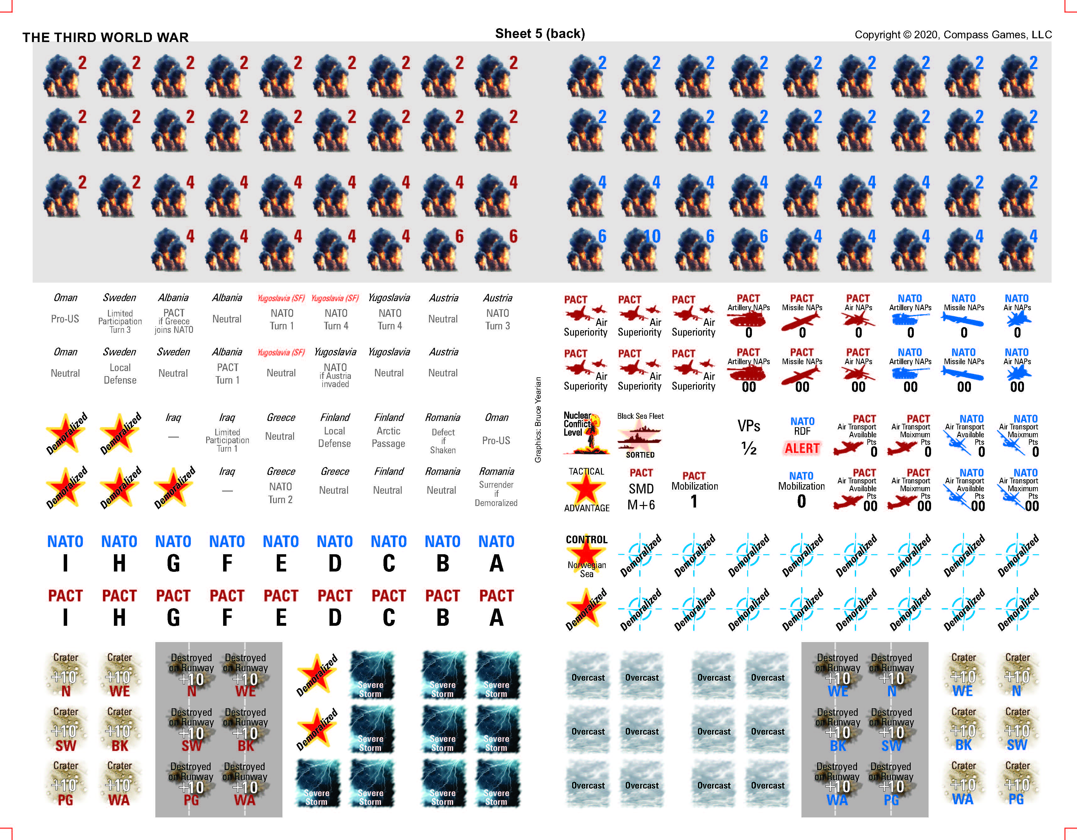 • Player aid cards and associated markers, for tracking nuclear conflict level and nuclear attack points (NAPs), air transport points, and victory points
