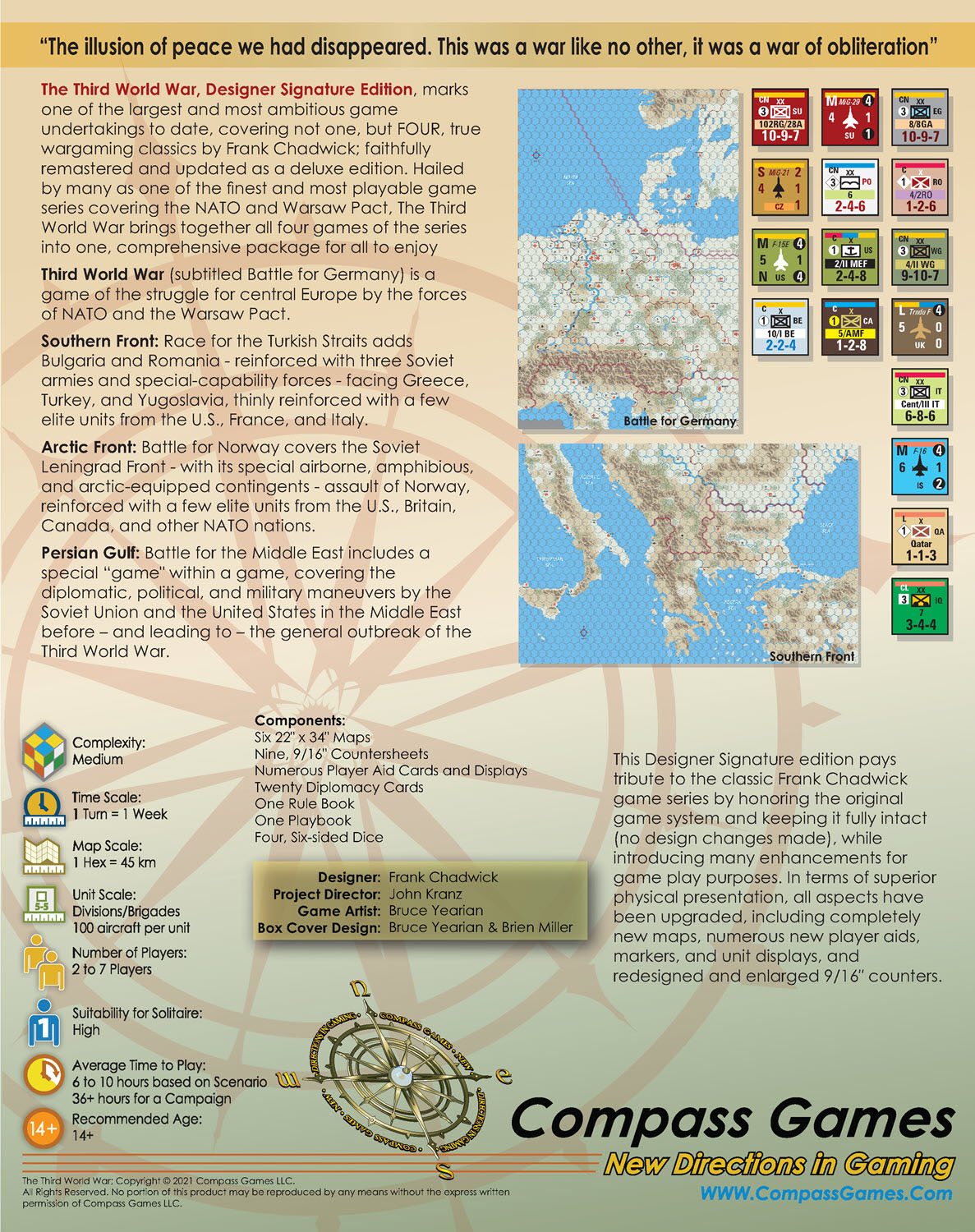 The Third World War: Designer Signature Edition, marks one of the largest and ambitious game undertakings to date. It covers not one but four true wargaming classics by Frank Chadwick—faithfully remastered and updated. Hailed by many as one of the finest and most playable game series covering the NATO and Warsaw Pact, Third World War brings together all four games into one comprehensive package.