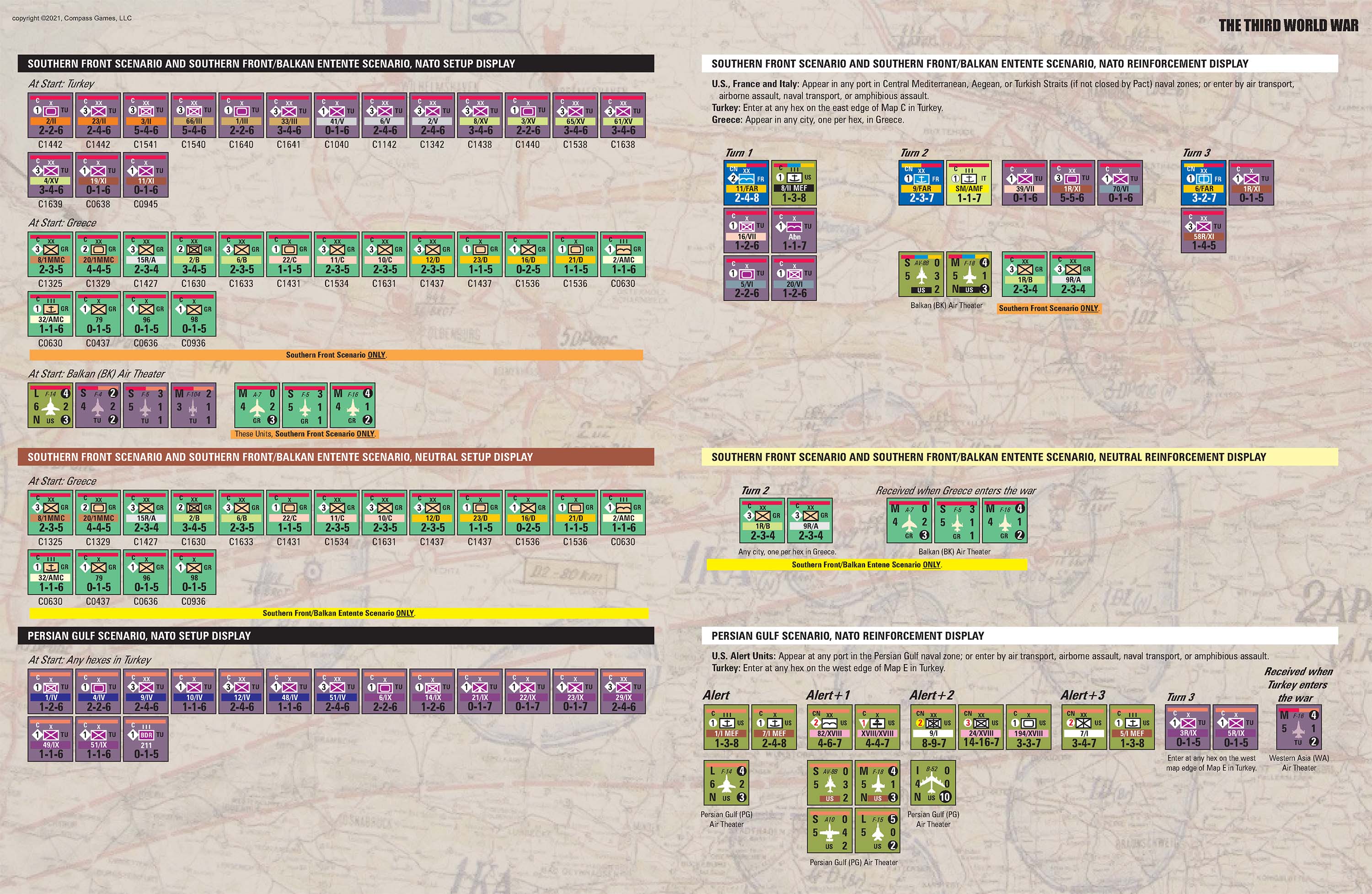• Southern Front: Race for the Turkish Straits adds Bulgaria and Romania, reinforced with three Soviet armies and special-capability forces, face Greece, Turkey, and Yugoslavia, thinly reinforced with a few elite units from the U.S., France, and Italy.