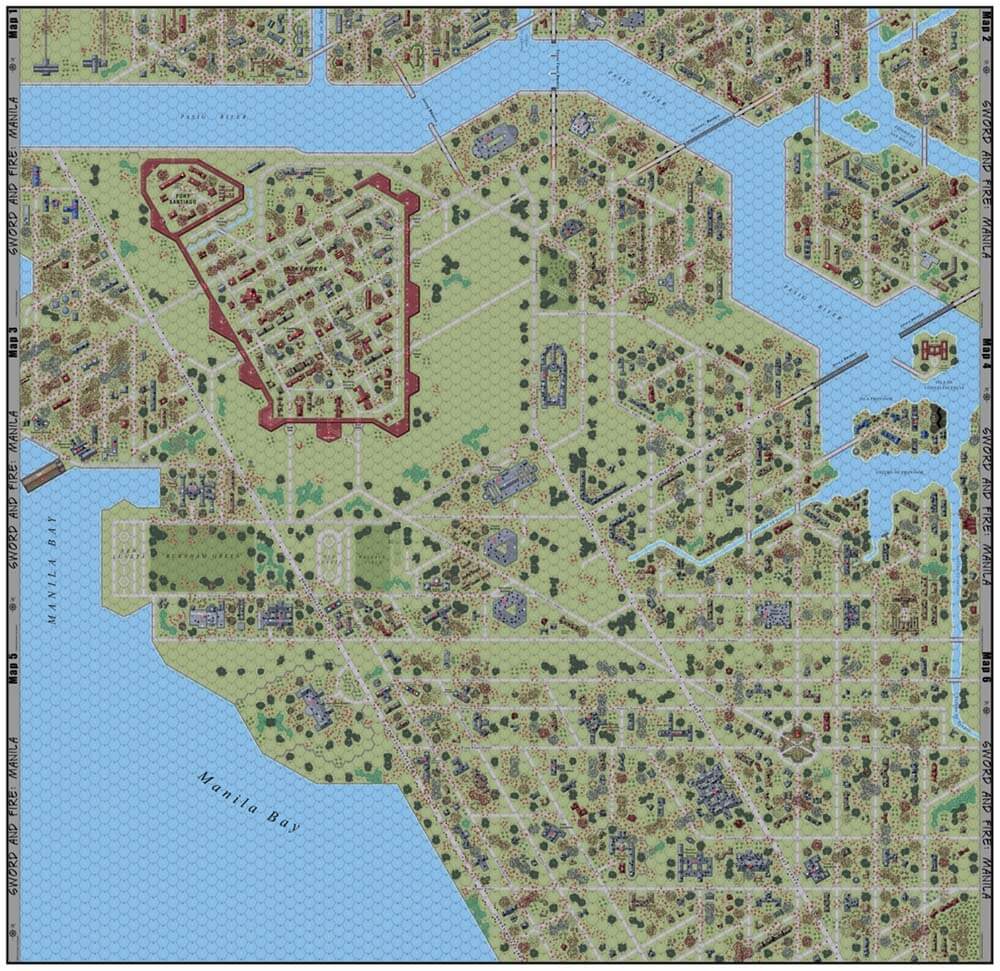 Sword and Fire: Manila features rules for the city’s unique terrain types: Multi-Material, Adobe, Steel-Walled Buildings, Stone Monuments, Bomb Craters, the many detailed elements of Intramuros, and a host of others. The game has twenty-five scenarios and five Campaign Games (CG) ranging in size from 6-15 CG Dates. The scenarios are played out on six map sheets depicting the city.