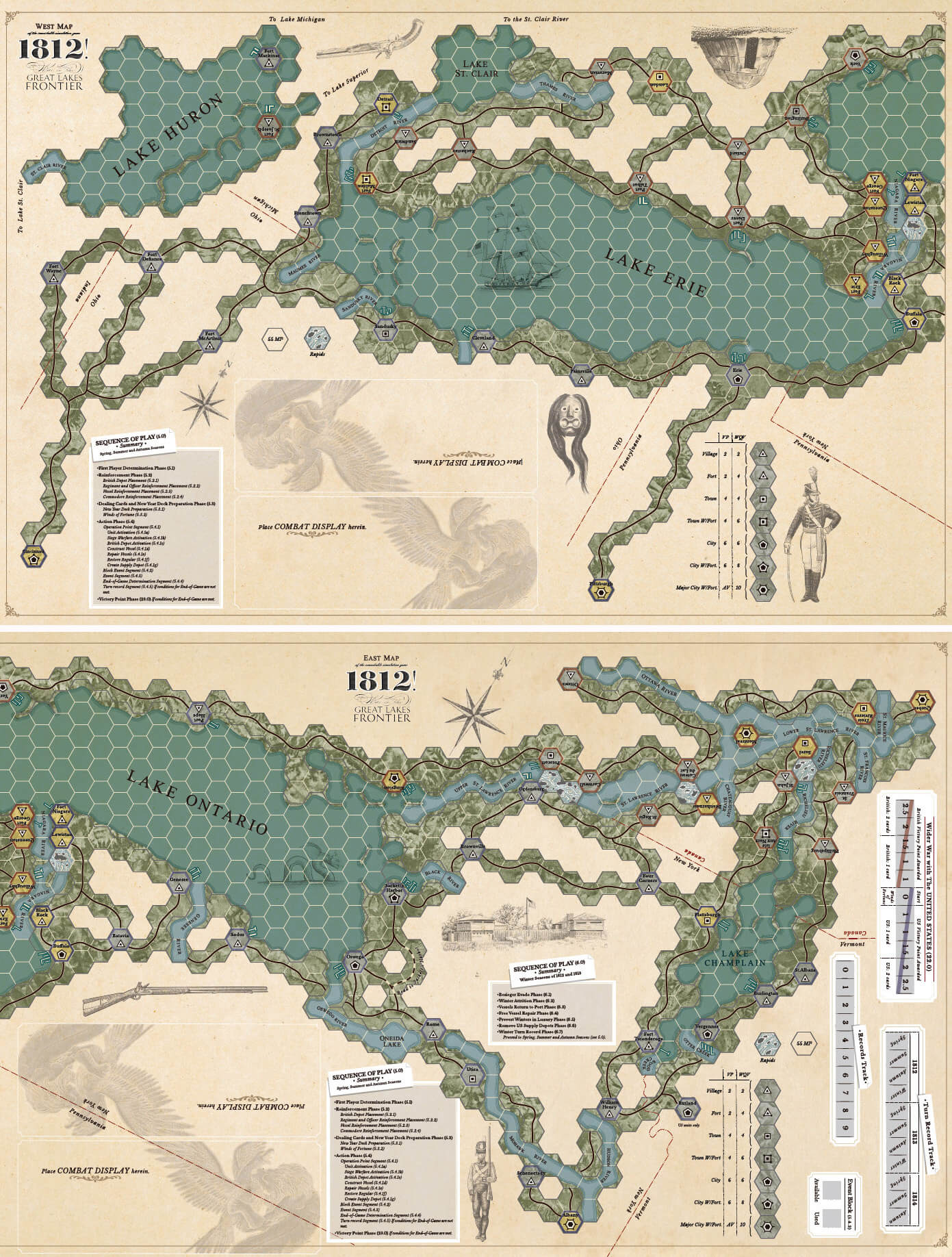 Unit density is small, 288 units over 2 maps at 55 square miles per hex. The playing area is a hex-based with a point-to-point feel encompassing the three primary battlegrounds of: Lake Erie, Lake Ontario, and Lake Champlain. There are no overly complicated systems or tables allowing quick and intuitive game play. The game scenarios range from a single map with each player holding one hand of 8 Strategy cards with a 1.5 hour playing time up to the full 2-map, nine-hand campaign averaging a 9 hour playing time. All of the scenarios and the full campaigns are highly re-playable with new experiences in each playing.