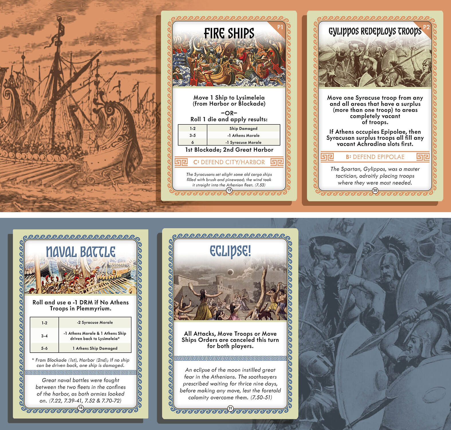 Game play is centered around using Field Commands to issue orders by the Athenian and Syracusan commanders to defeat each other. Either side can be defeated by their morale falling too low. The game allows you to play either side against a solitaire opponent that has 3 levels of difficulty.