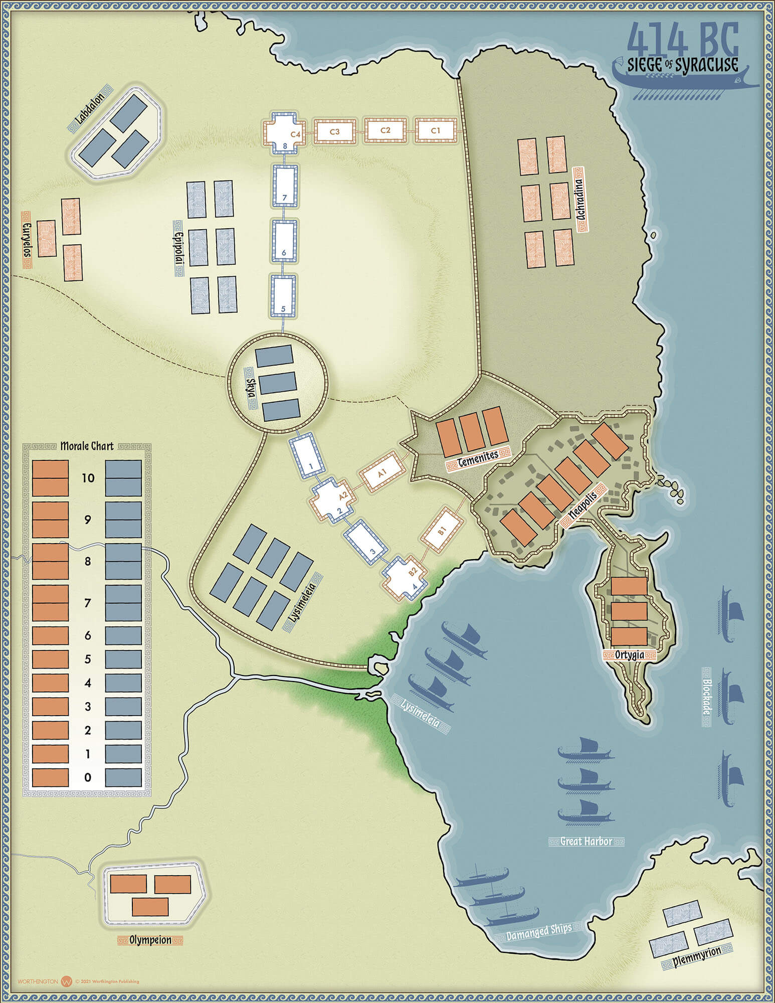 414 BC: The Siege of Syracuse is the second in Worthington Publishing’s Great Sieges game series. The other titles are 1565: Siege of Malta & 1759: Siege of Quebec.