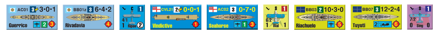 The British contingent is the most unusual. It has three aircraft carriers, two of them converted battle cruisers, and the third a modernized version of the early carrier Vindictive. They’re escorted by two modernized fast armored cruisers (seen in their original form in Jutland 1919), two old light cruisers, two old destroyers and three examples of the proposed but never built anti-aircraft version of the big Tribal-class destroyers (intended as carrier escorts, the role they fill here). The flight decks have older biplanes: Ripon torpedo bombers and Flycatcher fighters.